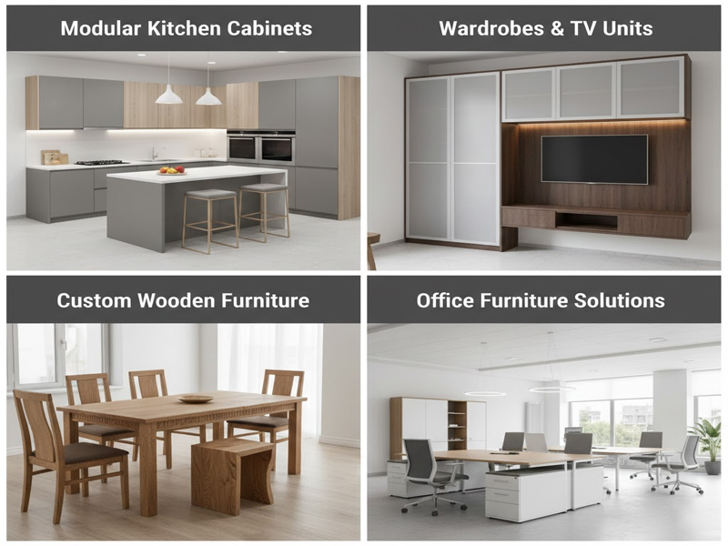 Our custom furniture services include modular kitchen cabinets, wardrobes and TV units, bespoke wooden furniture, and complete office furniture solutions. Each piece is thoughtfully designed to complement your interior theme while maximizing usability and storage.